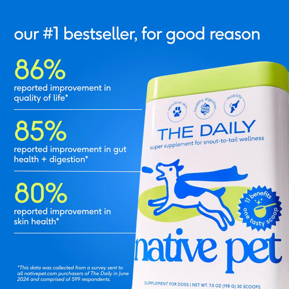 Because nobody likes runny poops or upset tummies! The Daily features our proprietary probiotic formula and pumpkin to help aid digestion, regulate bacteria, and support healthy bowel movements.